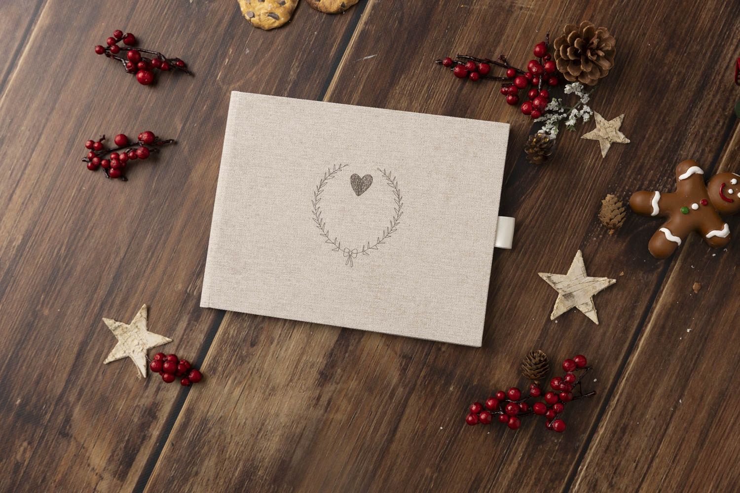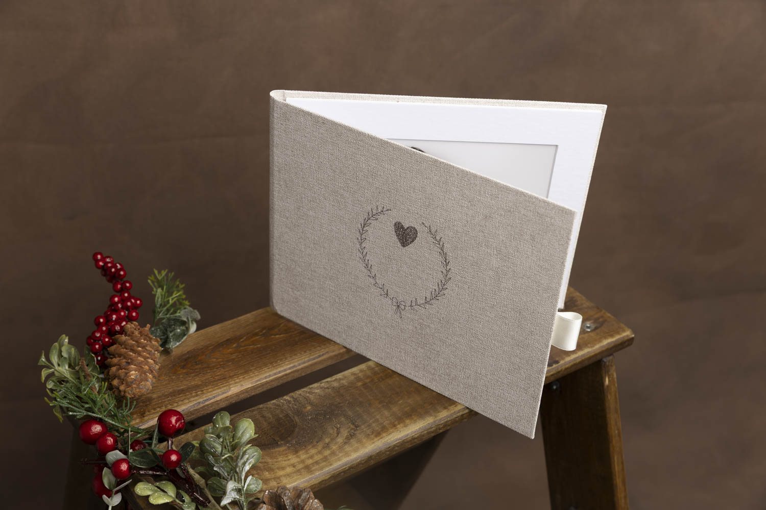 Un diptyque au format portrait ou paysage (13×18 cm), habillé d’une élégante couverture en lin beige, délicatement ornée d’une couronne gravée et d’un petit cœur.