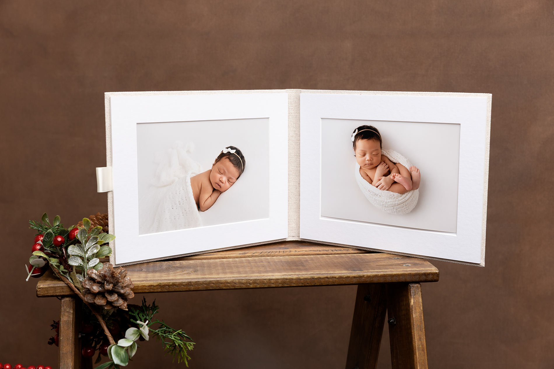 À l’intérieur, deux photos de votre mini-séance de Noël sont présentées sous passe-partout épais, pour un rendu doux, lumineux et intemporel.