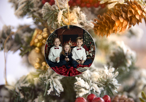 Un ornement photo rond à suspendre dans votre sapin de Noël, personnalisé avec une image issue de votre mini-séance.